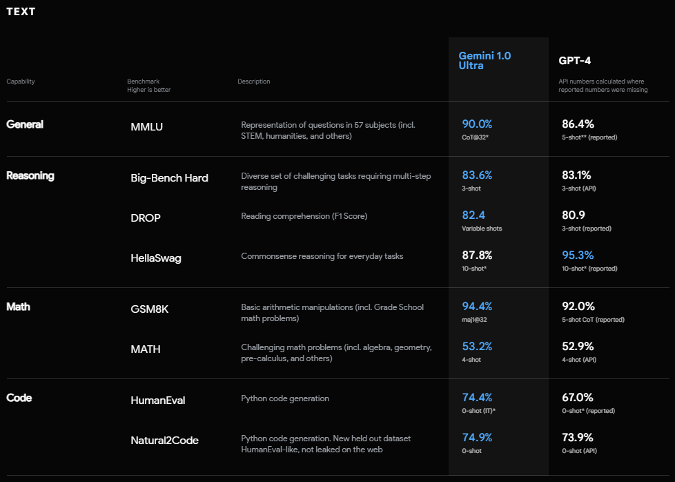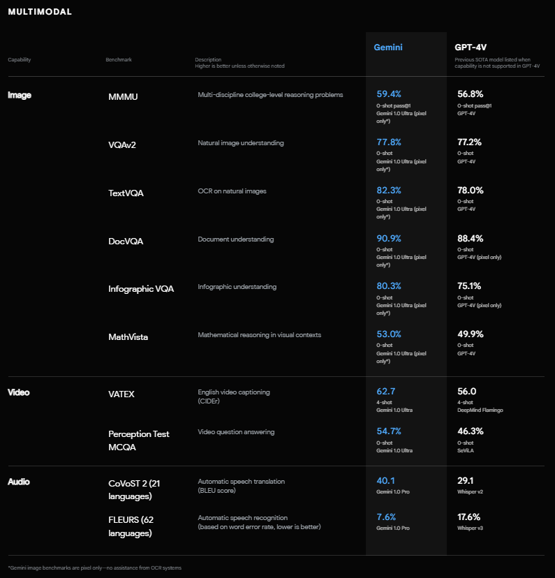 In various tests comparing Gemini Ultra 1.0 and GPT-4 on text-based data, Gemini Ultra 1.0 has been found superior in 7 out of 8 areas. When comparing visual, video, and audio models, Gemini has outperformed the GPT Vision model across all categories. However, whether this performance translates to real-world applications remains to be seen. You can experience Gemini by visiting gemini.google.com.