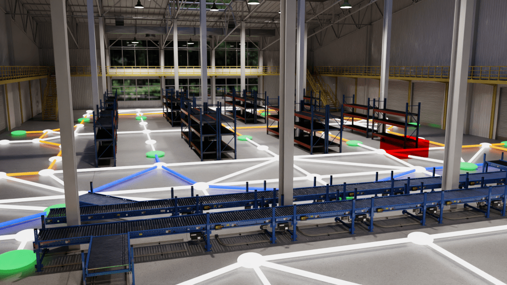 • Orange and blue lines indicate the paths that robots follow to pick up orders. These paths are calculated within seconds.